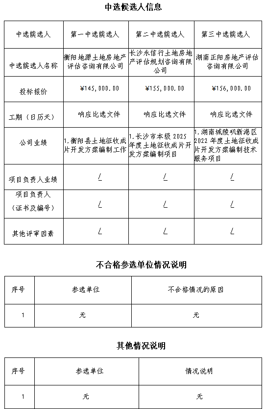 衡陽市雁城東路(東方里街-東二環(huán))及雁城東路與建湘連接線新建工程土地征收成片開發(fā)方案編制服務(wù)比選于2025年08月15日09時(shí)00分在衡陽國投4棟3樓評(píng)標(biāo)室進(jìn)行了比選開標(biāo)、評(píng)標(biāo)活動(dòng),評(píng)標(biāo)委員會(huì)按照比選文件及相關(guān)法律法規(guī)規(guī)定進(jìn)行評(píng)審,推薦以下三名中選候選人(排序),現(xiàn)將相關(guān)信息予以公示。